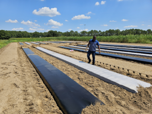 August, 2024: Jake Mowrer laying down plastic mulch in College Station, TX. Photo credit: Thomas Isakeit, Texas A&M University.