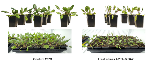 Fig. 8. Controlled-environment, pot-level heat stress experiment conducted in the commercial spinach variety Red-Tabby. Visible stress-induced responses were observed in plants exposed to 40 °C compared with those grown under optimal temperature conditions (20 °C).